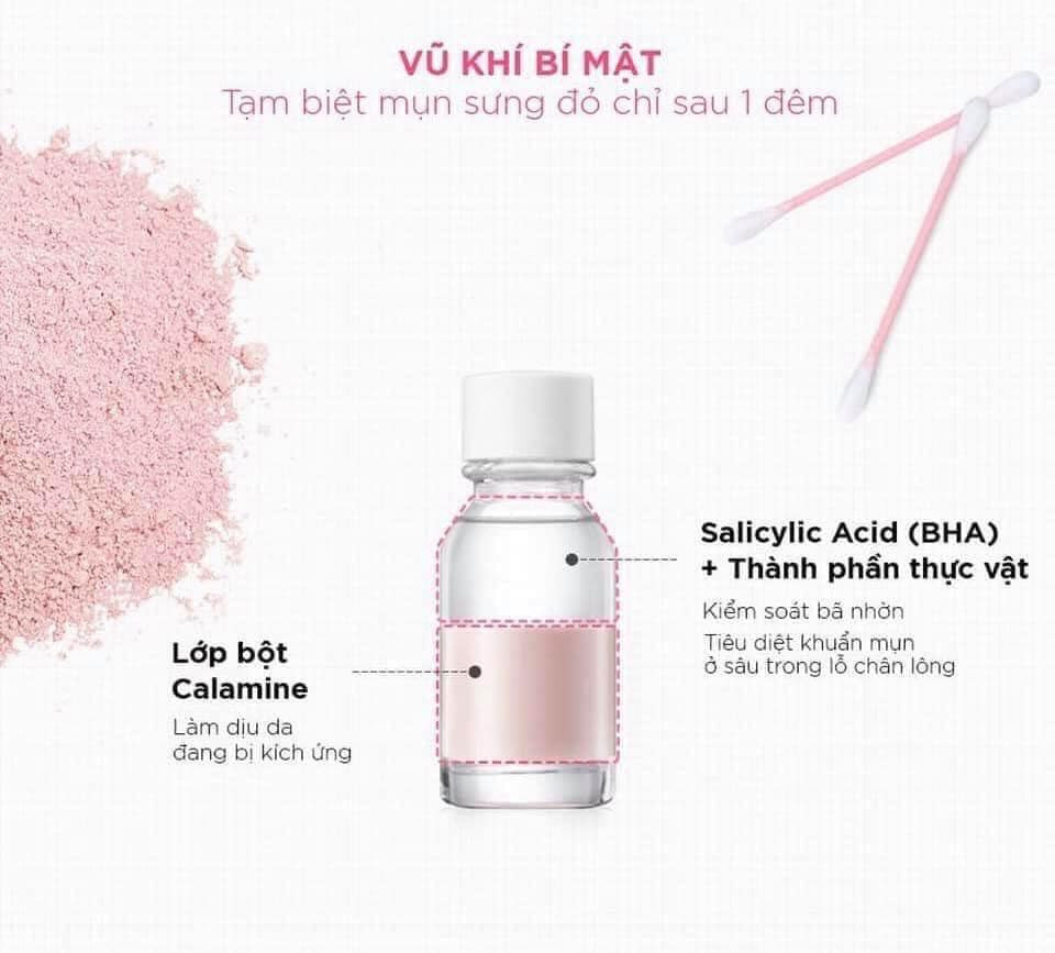 - Chứa bột Calamine giàu kẽm trợ giúp làm dịu vùng da đang bị mụn sưng đỏ.