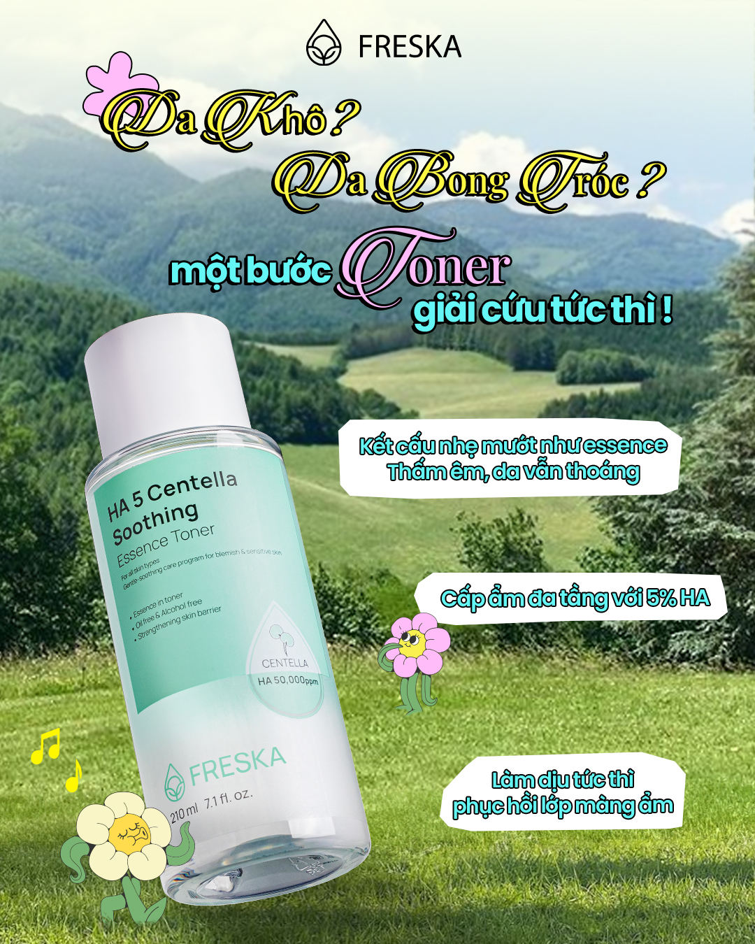 Toner Freska HA5 Centella: Rau má + HA phân tử nhỏ giúp làm dịu da, giảm mẩn đỏ, phục hồi hàng rào bảo vệ và giữ ẩm bền lâu.
