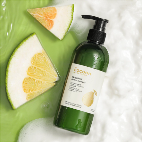 Dầu gội bưởi Pomelo cocoon thuần chay chiết xuất Từ tinh dầu vỏ bưởi Việt Nam truyền thống kết hợp với vitamin B5, hoạt chất dưỡng ẩm Xylishine™ cùng công thức dịu nhẹ không chứa sulfate, dầu gội bưởi giúp làm sạch tóc và giảm gãy rụng, mang lại mái tóc đen dày, chắc khoẻ và mượt mà.