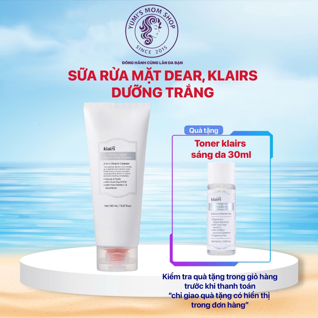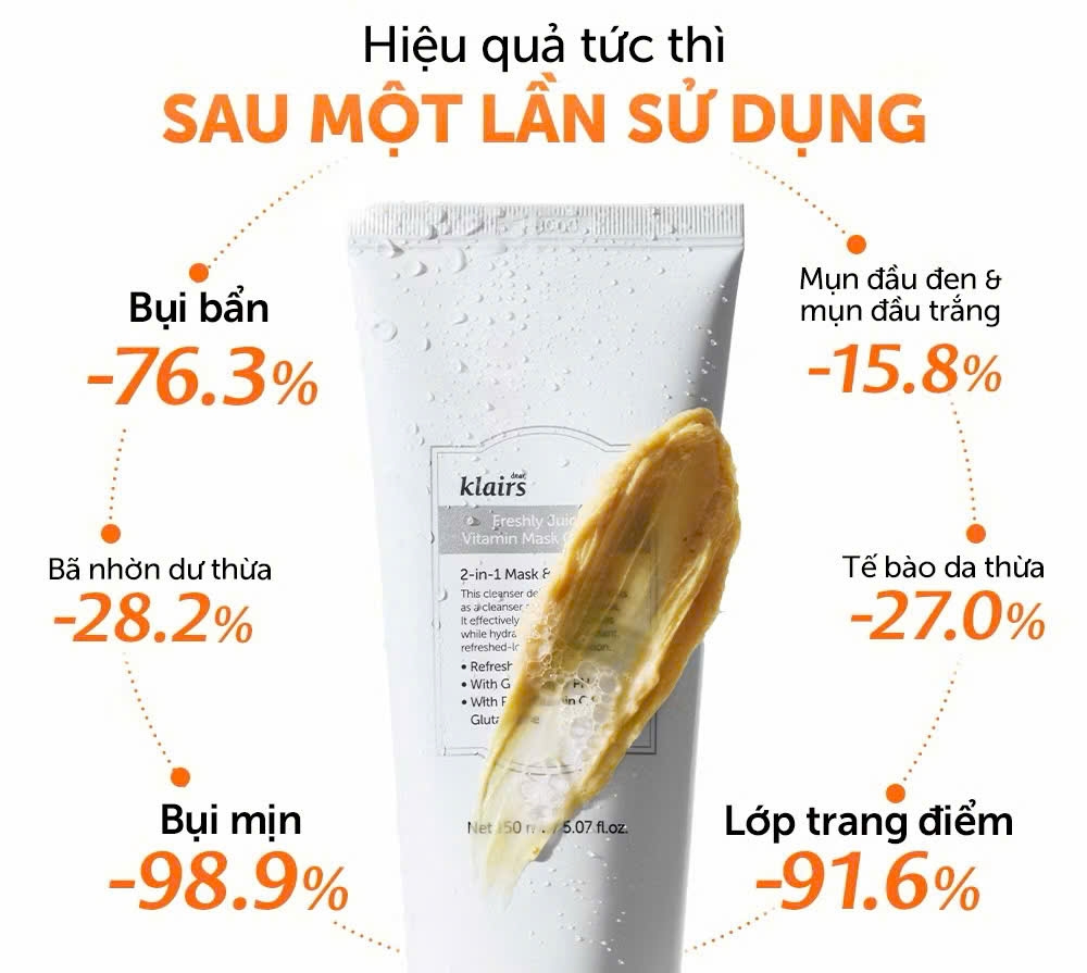 Sữa rửa mặt đất sét 2-in-1, DƯỠNG SÁNG và cải thiện các vấn đề lỗ chân lông Dear, Klairs Freshly Juiced Vitamin Mask Cleanser với kết cấu dẻo dính như phô mai dẻo và rất mềm mượt, mang lại cảm giác mềm mịn trên da khi sử dụng và tránh các tác động mạnh lên da. Nhưng vẫn đảm bảo hiệu quả làm sạch vượt trội.