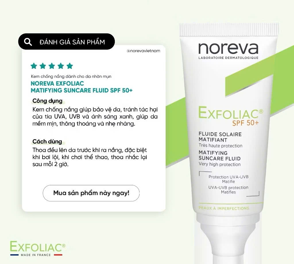 🔥 Kem chống nắng dành cho da dầu mụn Noreva Exfoliac Matifing Suncare Fluid SPP50+ 40ML