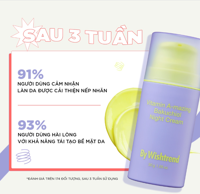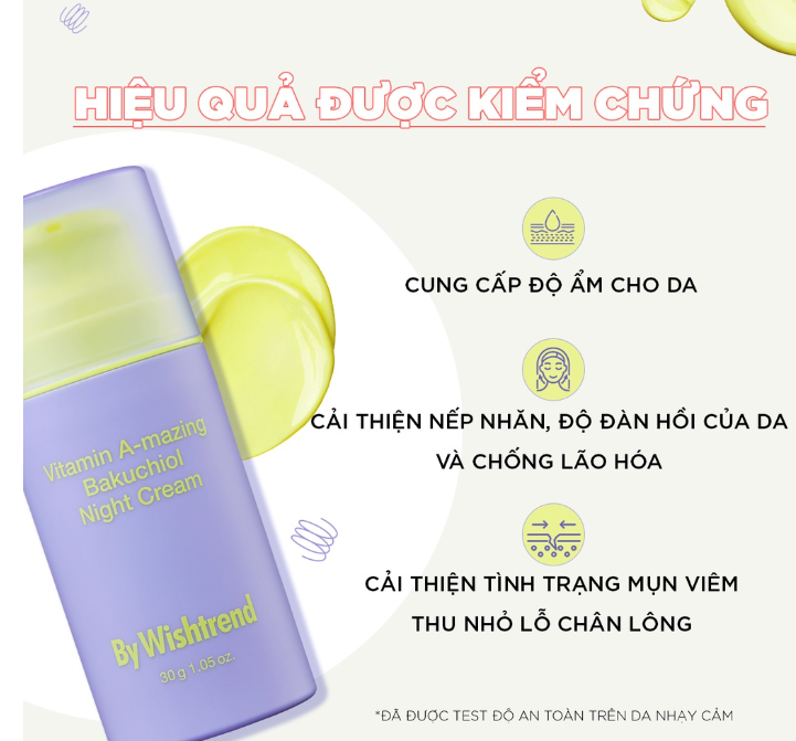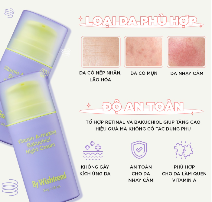 Kem dưỡng da ban đêm với thành phần chính từ 1% Bakuchiol kết hợp cùng 0.03% Retinal giúp bổ sung độ ẩm, thúc đẩy quá trình tổng hợp collagen và elastin nhằm giảm sự xuất hiện của các nếp nhăn, cải thiện độ đàn hồi và ngăn ngừa các dấu hiệu lão hóa.