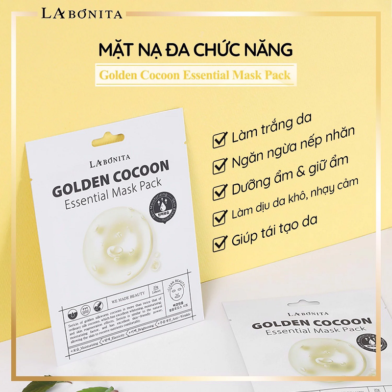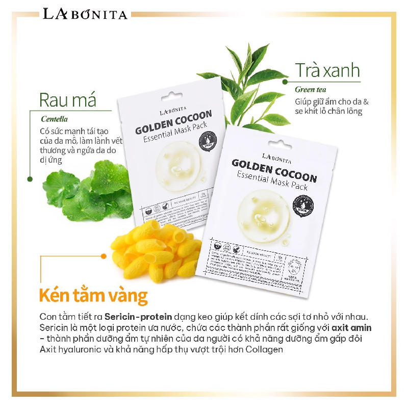 Labonita Essential Mask Pack là mặt nạ chiết xuất kén vàng chứa một lượng lớn protein gọi là sericin và có tác dụng giúp làm sáng và giảm nếp nhăn.