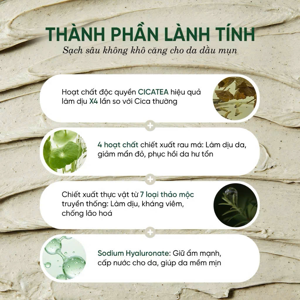 - Bột trà xanh + chiết xuất trà xanh: thanh lọc lỗ chân lông, hỗ trợ giảm bít tắc.