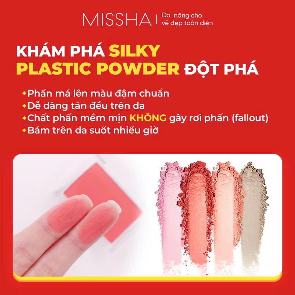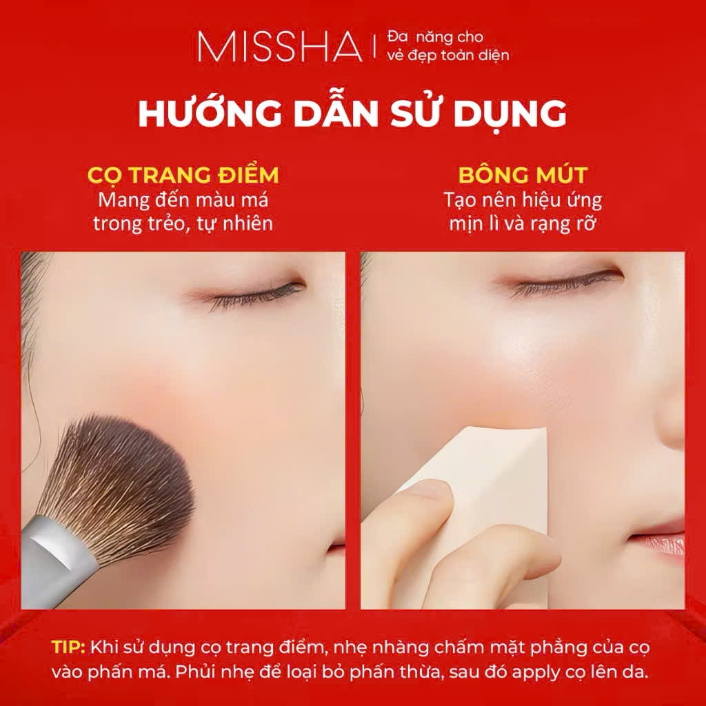 Phấn má hồng Missha Cotton Blush với độ lên màu tinh tế và nhẹ nhàng, không chỉ tô điểm cho bầu mà rạng rỡ mà còn đem lại hiệu ứng mịn lì, che phủ lỗ chân lông. Chất phấn cải tiến Silky Elastic Powder mịn lì như nhung tăng hiệu quả bám màu trong thời gian dài. Bạn có thể tận dụng phấn má Cotton Blush để làm phấn mắt, giúp tổng thể gương mặt hài hoà và tràn đầy sức sống hơn.