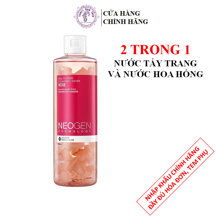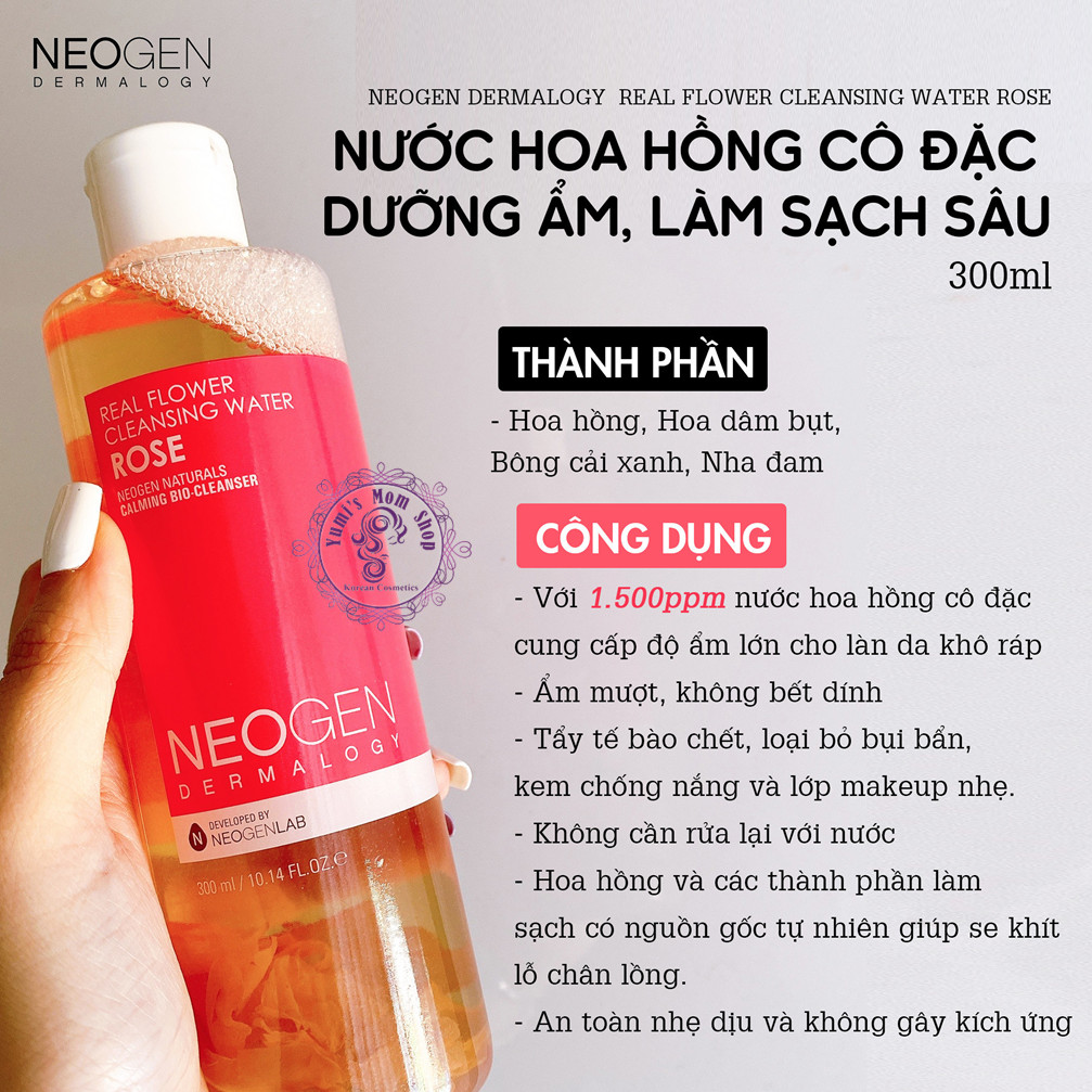 Neogen Real Flower Cleansing Water là nước hoa hồng dịu nhẹ, không gây kích ứng; giúp cấp ẩm cho làn da khô ráp, nhăn nheo và tẩy sạch bụi bẩn cùng lớp trang điểm trên da một cách nhanh chóng; mang lại cảm giác ẩm mượt nhờ thành phần có chiết xuất 100% từ cánh hoa Hồng tươi và các thành phần có nguồn gốc tự nhiên khác.