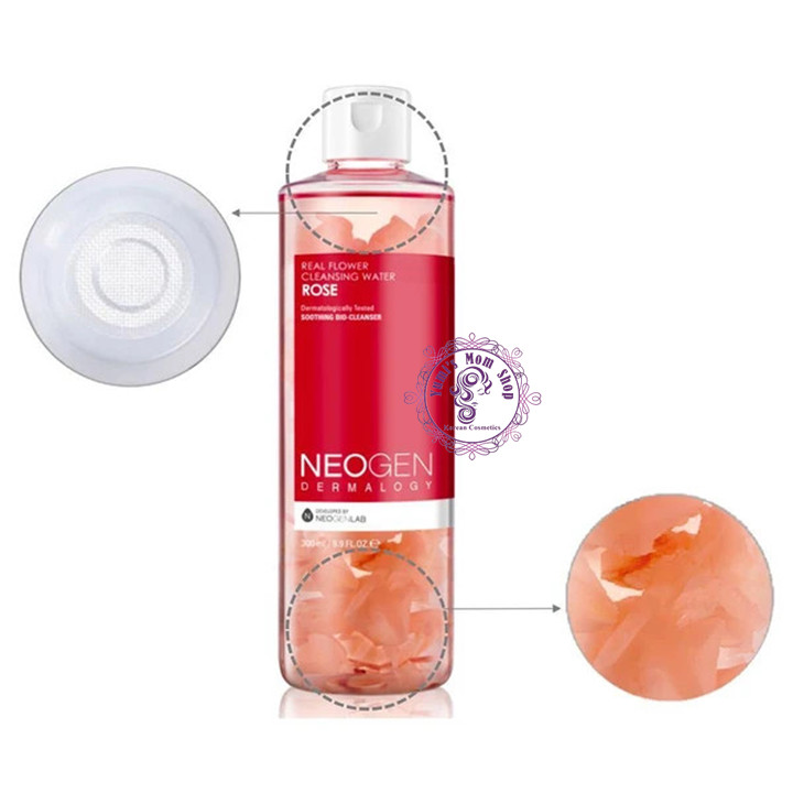 - Làm dịu: Với chiết xuất 1500ppm cánh hoa Hồng tươi, Neogen Real Flower Cleansing Water sẽ cấp ẩm cho làn da khô nhăn một cách nhanh chóng và mang lại cảm giác ẩm mượt.