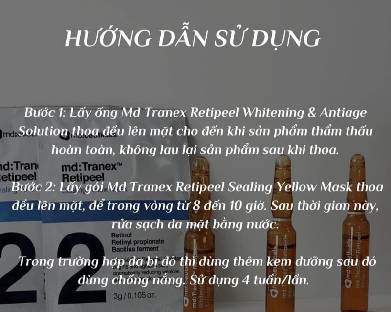 - Thoa ống md:Tranex™ Retipeel Whitening &Antiage Solution trên toàn bộ khu vực peel. Nhẹ nhàng massage vào cho đến khi hấp thụ hoàn toàn. Để trong 5 -10 phút và KHÔNG LAU HOẶC RỬA NHÉ!