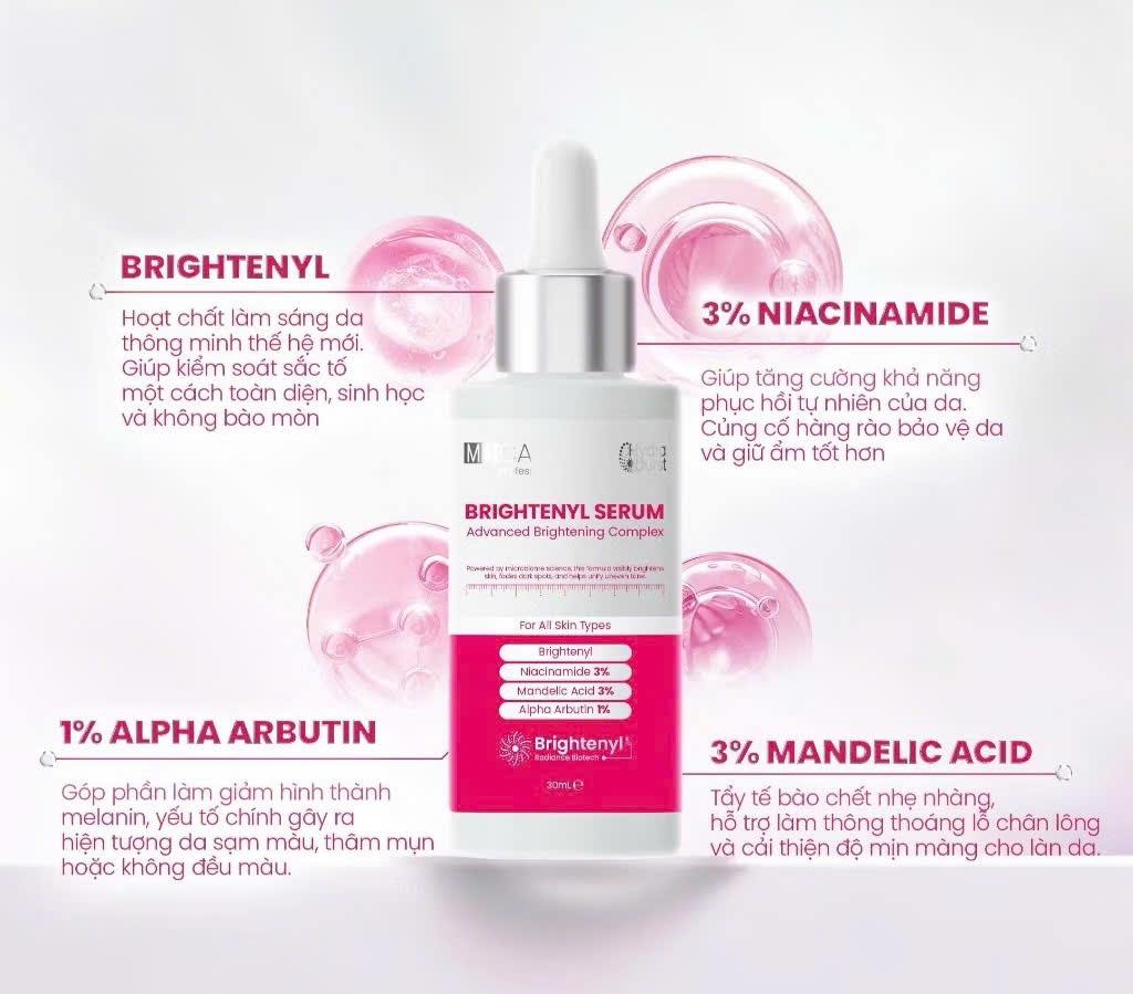 - Brightenyl: Giúp cải thiện tổng thể sắc tố da, hỗ trợ làm mờ vùng da sạm màu và mang lại làn da đều màu, sáng mịn và khỏe mạnh hơn.