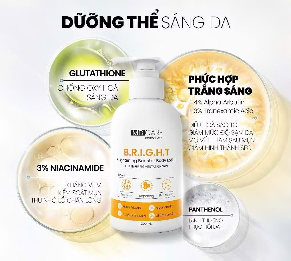 Nhằm nâng cao hiệu quả dưỡng sáng - phục hồi và mang đến trải nghiệm chăm sóc da tốt hơn cho người dùng, MD CARE đã tiến hành cải tiến công thức sản phẩm Brightening Booster Body Lotion. Chúng tôi xin trân trọng thông báo về việc điều chỉnh công thức thành phần của sản phẩm, chính thức áp dụng kể từ tháng 06/2025. Các công thức chính và nồng độ trong thành phần như sau: