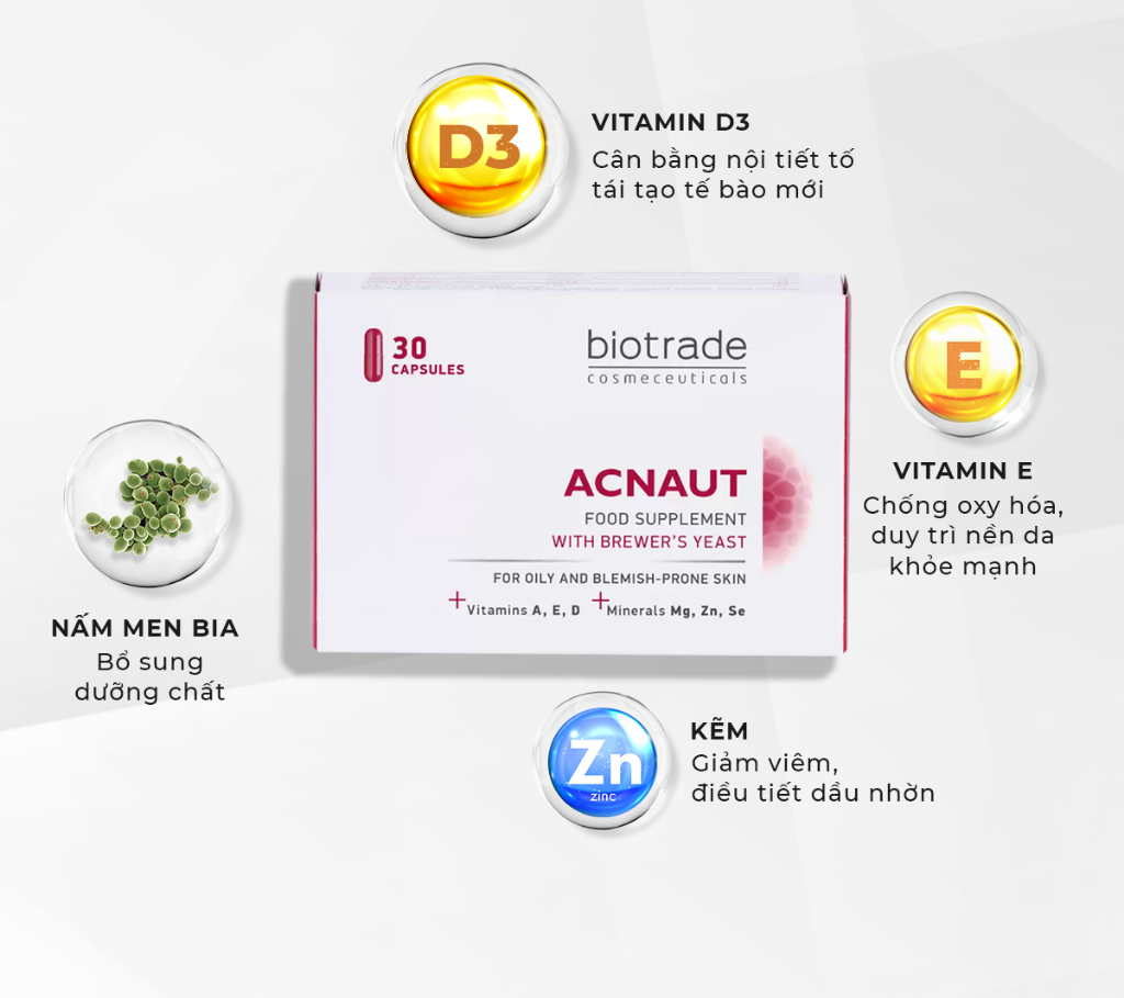- Vitamin D3: Hỗ trợ cân bằng nội tiết tố và tăng cường tái tạo tế bào da mới.