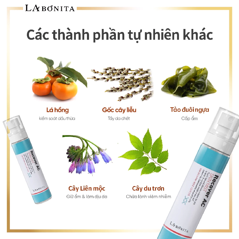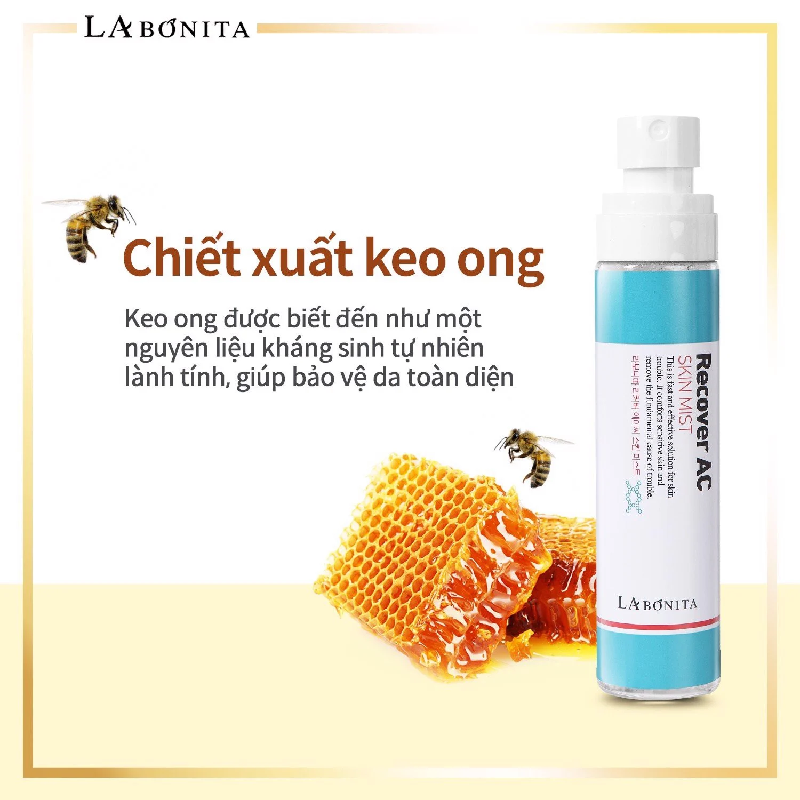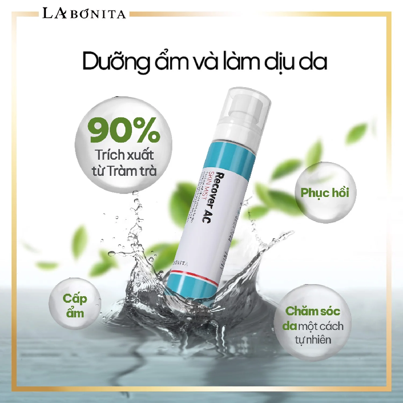 Xịt Khoáng giảm mụn La Bonita Recover AC Skin Mist thuộc dòng Toner 4in1 được tạo ra dành cho những làn da đang bị mụn. Recover Skin Mist sẽ cấp ẩm sâu vào da và khoá ẩm lại cho cả 1 ngày dài, đồng thời sẽ làm khô mặt của mụn. Với Công thức chuyên nghiệp Recover Skin Mist sẽ xử lý các vấn đề cho da, trả lại sự rạng rỡ và mịn màng cho da mặt.
